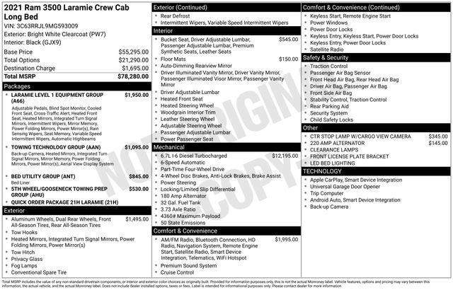 South Fork Chrysler Jeep Dodge Ram is proud to offer this great-looking 2021 Ram 3500 in Bright White Clearcoat. This vehicle has passed our comprehensive inspection and comes with the following features: CARFAX One-Owner. Odometer is 32540 miles below market average! *4WD, Turbo Diesel Power, Bluetooth, Hands-Free connection, Navigation!, Backup Camera, Cruise Control, Keyless Entry, Power Locks, Power Windows, Heated Seats, Leather Seats, Towing Package, Adaptive Cruise Control, Apple Carplay, Android Auto, 5th Wheel Set up, 12" Touchscreen Display, 220 Amp Alternator, 2nd Row In Floor Storage Bins, 4G LTE Wi-Fi Hot Spot, 5-Year SiriusXM Traffic Service, 6000# Front Axle w/Hub Ext, ABS brakes, Air Conditioning, Apple CarPlay, Apple CarPlay/Android Auto, Auto High Beam Headlamp Control, Automatic temperature control, Bed Utility Group, Blind Spot & Cross Path Detection (DISC), Electronically Controlled Throttle, Exterior Mirrors w/Memory, Foam Bottle Insert (Door Trim Panel), Garage door transmitter, Google Android Auto, GPS Navigation, Heated Steering Wheel, Illuminated entry, Laramie Level 1 Equipment Group (DISC), Leather steering wheel, LED Bed Lighting, Low tire pressure warning, Mirror-Mounted Aux Reverse Lamps, MOPAR Deployable Bed Step, MOPAR Spray In Bedliner, Occupant sensing airbag, Outside temperature display, Overhead airbag, Power Adjustable Convex Aux Mirrors, Power Adjustable Pedals w/Memory, Power Chrome Tow Mirrors w/Convex Spotter & Memory, Quick Order Package 21H Laramie, Radio/Driver Seat/Mirrors/Pedals Memory, Rain Sensitive Windshield Wipers, Remote Tailgate Release, SiriusXM Traffic Plus, SiriusXM Travel Link, Surround View Camera System, Towing Technology Group (DISC), Trailer Reverse Guidance, Ventilated Front Seats.
