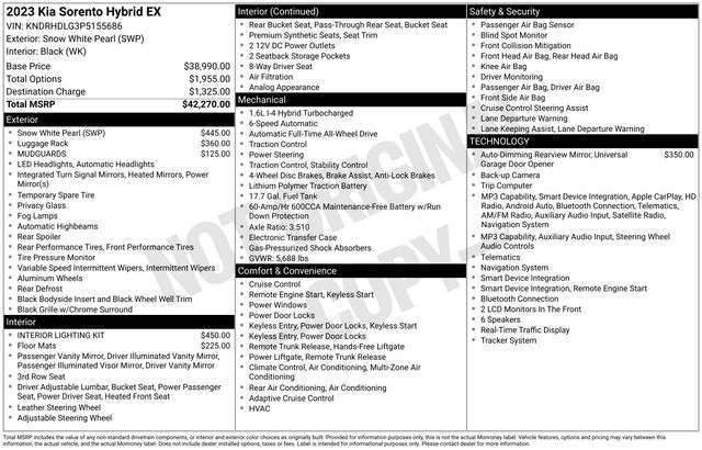 Under the hood, the Sorento Hybrid EX is powered by a 1.6L I4 DGI Hybrid Turbocharged DOHC 16V LEV3-ULEV70 engine, delivering an impressive 36 MPG in the city and 33 MPG on the highway. With its seamless 6-Speed Automatic transmission and standard All-Wheel Drive, you'll enjoy a confident and responsive ride, no matter the conditions.